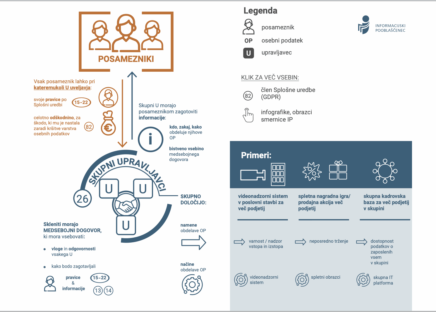 V novi infografiki IP pojasnjuje koncept skupnega upravljanja – gre za primere, ko več upravljavcev skupaj določi namene in sredstva obdelave osebnih podatkov, npr. v okviru skupnih trženjskih akcij, enotnih spletnih platform in videonadzornih sistemov ali skupnih kadrovskih baz. Skupni upravljavci morajo skleniti medsebojni dogovor, ki mora vsebovati opis vlog in odgovornosti vsakega upravljavca ter informacije o tem, kako bodo zagotavljali pravice in informacije za posameznike, predvsem glede nabora in namenov obdelave.